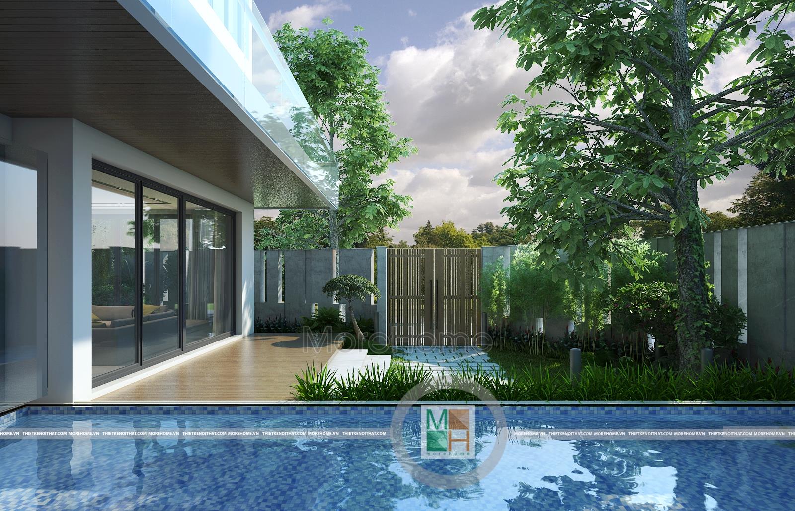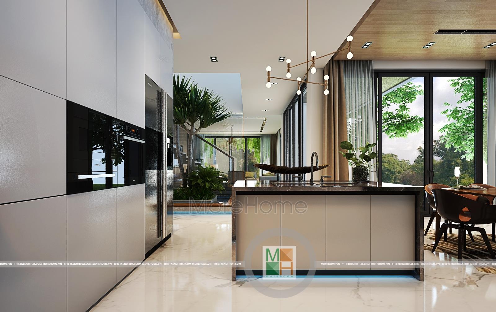 Phân tách giữa phòng khách với các không gian khác là vách kính cường lực trong suốt nhưng vẫn có được sự liền mạch. Sau vách kính là cầu thang lên tầng 2. Với không gian rộng nên dưới chân cầu thang còn được bố trí thêm tiểu cảnh với cây xanh và một bồn nước nhỏ điều hòa không khí cho phòng ăn và phòng bếp bên cạnh. Phòng ăn và phòng bếp được thiết kế trong cùng một không gian nội thất. Các kiến trúc sư đã khéo léo sắp đặt thành một không gian riêng biệt tạo thành góc L với cấu trúc chung của căn biệt thự. Bàn ăn lớn dành cho 10 người rất phù hợp với những buổi tiệc tùng liên hoan hay những bữa cơm sum họp gia đình ấm cúng. Phòng ăn với 3 vách kính thông thoáng nên có thể tận dụng tối đa được ánh sáng tự nhiên và không dùng nhiều tới hệ thống chiếu sáng chung trong nhà. Điểm khác biệt của không gian này là không sử dụng trần thạch cao mà sử dụng trần gỗ tạo điểm nhấn rất riêng.
