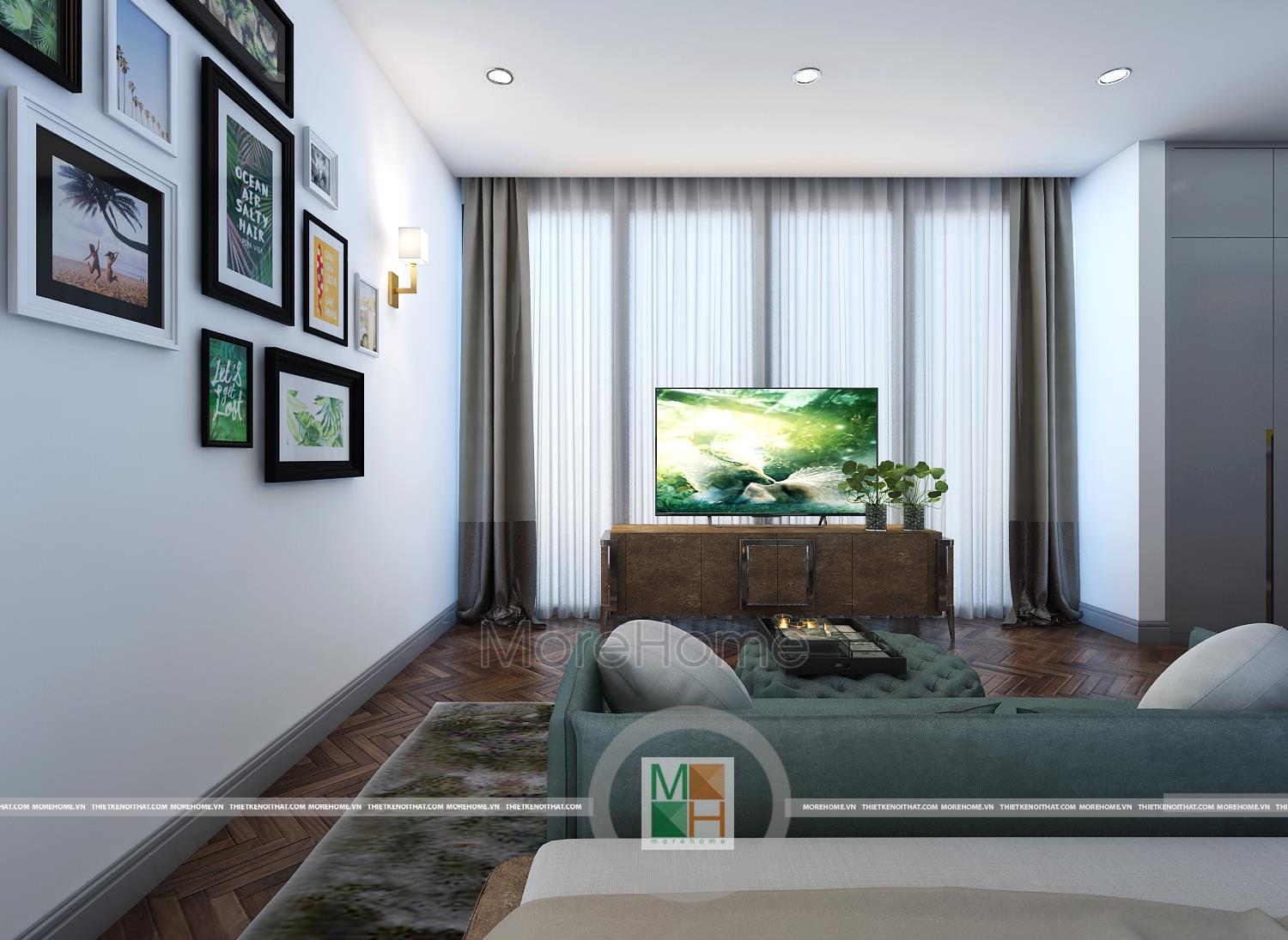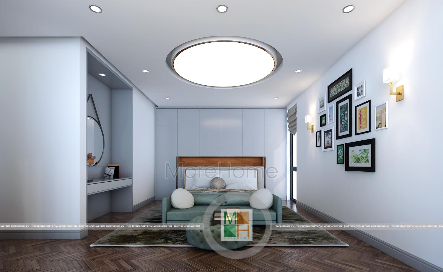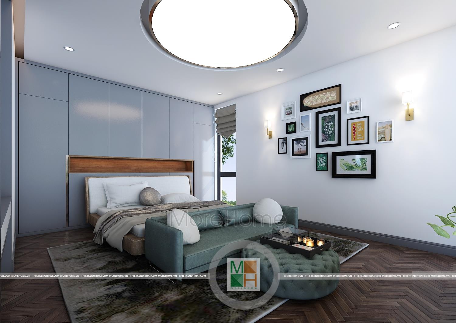 Căn phòng đầu tiên nhiều tiện nghi nhất với thiết kế độc đáo. Diện tích căn phòng khá rộng nên kiến trúc sư có tư vấn kê thêm một bộ sofa đơn giản màu ngọc lam đậm. Bạn cũng có thể dùng căn phòng này để tiếp khách trong trường hợp khẩn cấp. Hệ thống tủ đồ và tủ trang trí đa số được thiết kế âm tường nên căn phòng có được độ phẳng nhất định. Trong căn phòng ngủ này còn sử dụng đèn mâm âm trần lớn thay thế cho tất cả những thiết bị chiếu sáng thông thường khác.