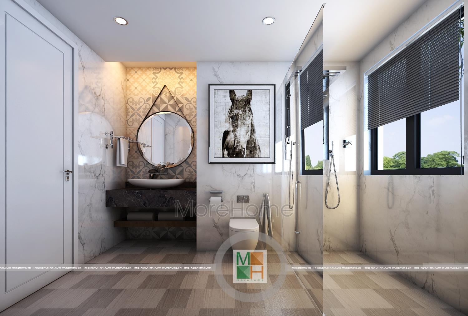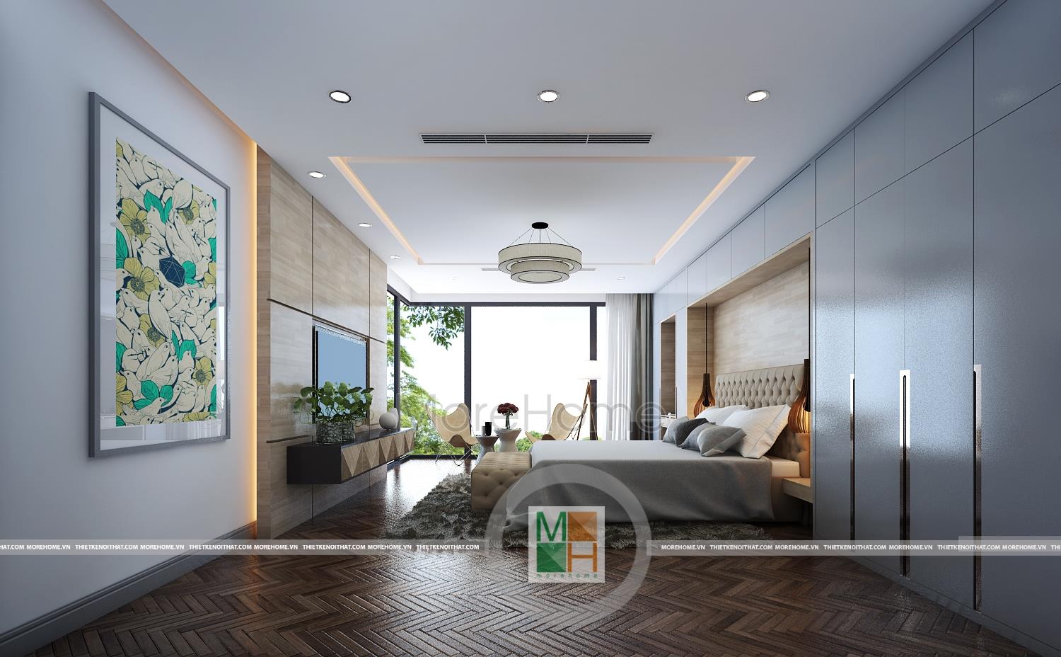 Kết thúc không gian tầng 1 tại đây chúng ta cùng tham khảo thiết kế nội thất tầng 2. Thiết kế cho tầng 2 chủ yếu là các phòng ngủ với 3 phòng riêng biệt khép kín với phòng vệ sinh riêng. Không giống như tầng 1 sàn được lát đá bóng sang trọng thì tầng 2 lại sử dụng ván sàn gỗ tự nhiên ấm cúng, ván sàn được lắp đặt theo hình xương cá đảo chiều cấu trúc rất riêng biệt và độc đáo.