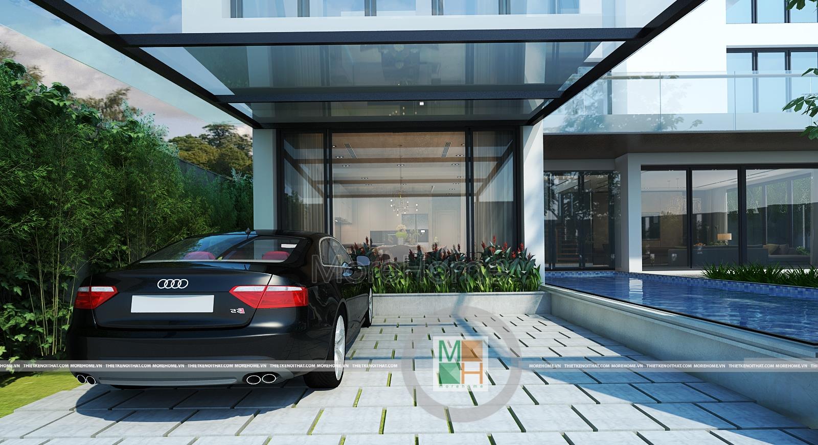 Không gian cho tầng một được thiết kế mở hoàn toàn cho cả khu vực nội thất và ngoại thất. Điểm nhấn đặc biệt được bố trí cho không gian ngoại thất. Đầu tiên phải nói đến sự khác biệt với những gara ô tô khác, gara ô tô nhà anh Phúc được thiết kê ngoài trời với mái che được làm từ kính cường lực cao cấp với tính chất kết nối không gian tầm cao hơn nữa vách kính cường lực rất chắc chắn. Bên cạnh gara là bể nước điều hòa chạy thẳng từ ngoài cổng vào tới hiên nhà chính với chiều rộng của bể nước khoảng hơn 1m giúp không gian ngoại thất có sắc màu riêng và mát mẻ hơn trong những ngày hè oi bức