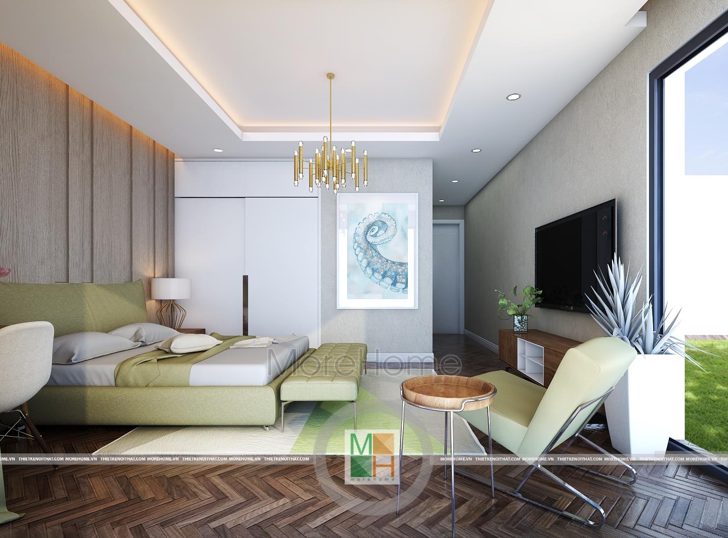 Phòng ngủ cuối cùng được trang trí với tone màu xanh lá trẻ trung năng động