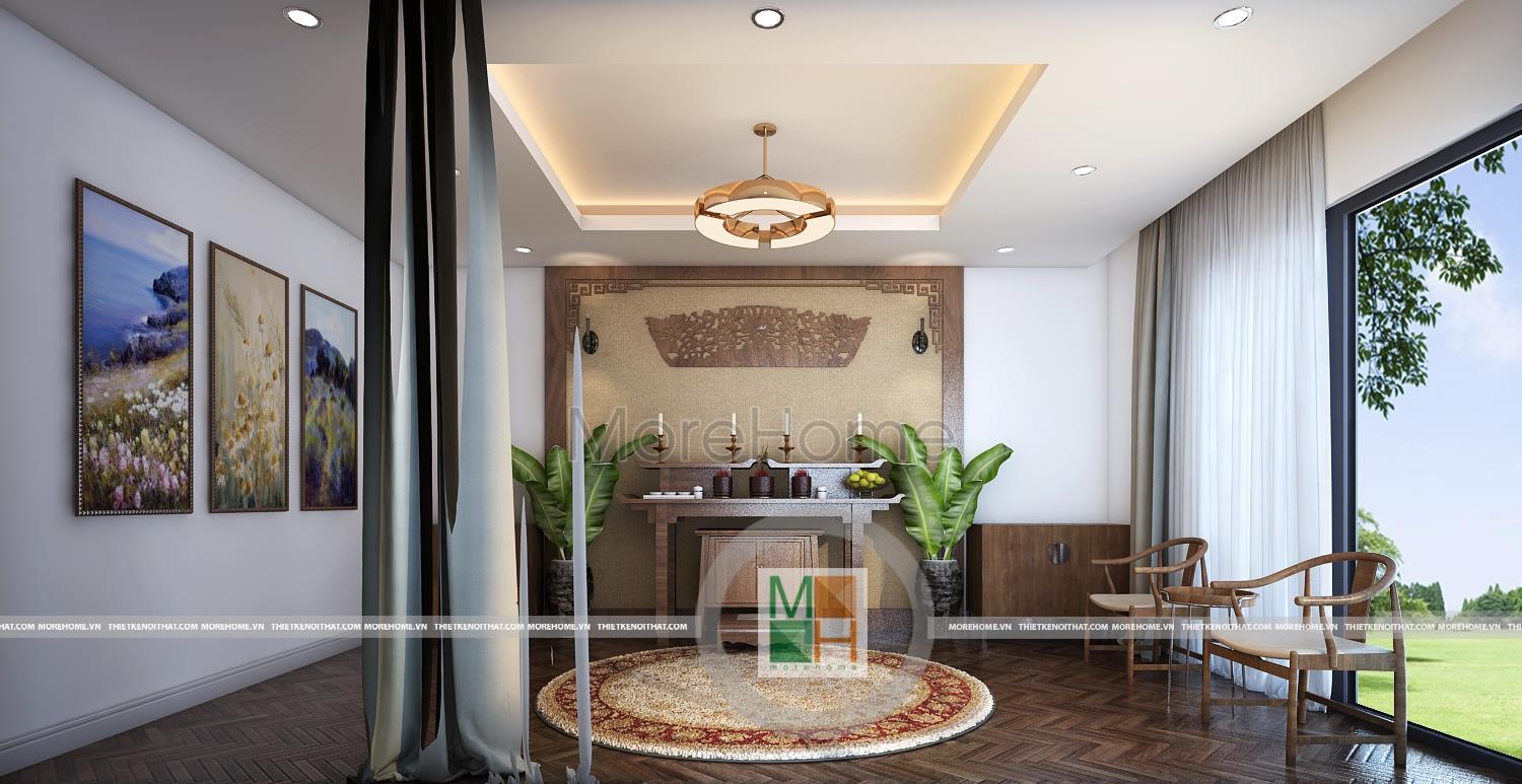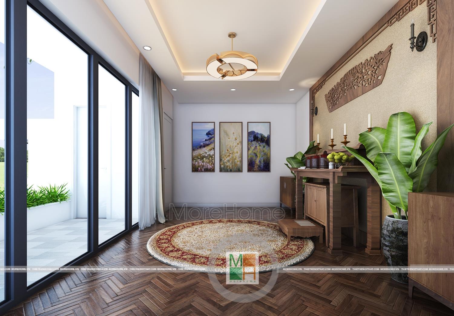 Trên tầng 3 là khu vực tâm linh có phòng thờ riêng khá quy mô với bàn sập thấp, tủ thờ và kệ bàn thờ. Bên ngoài phòng thờ có ban công thoáng.