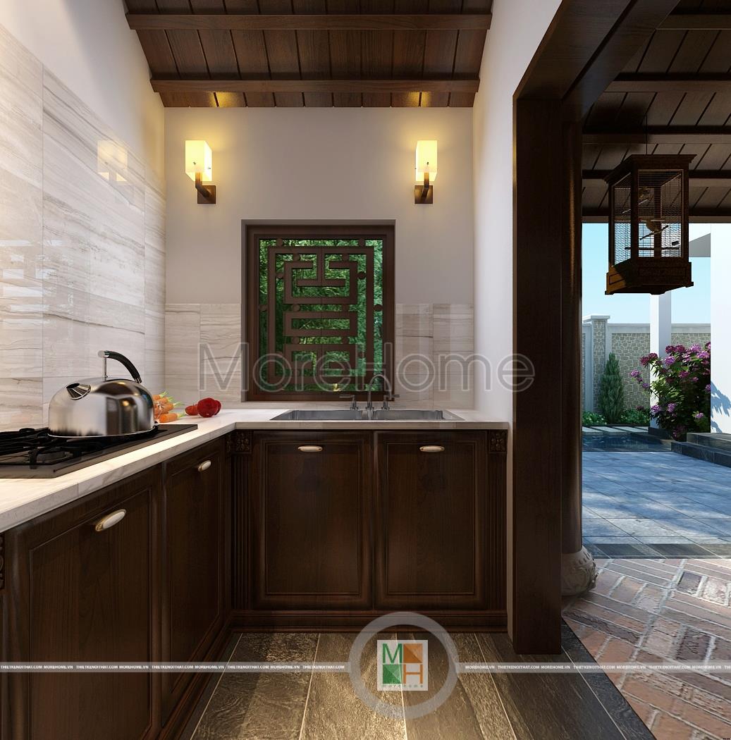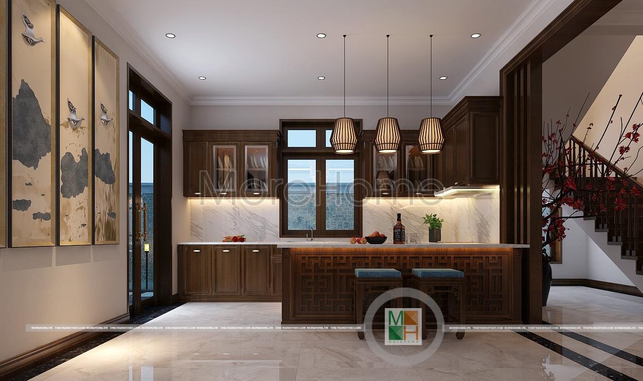 Không gian bếp chứ L với tủ bếp tân cổ điển, bàn bar bếp vừa là nơi chế biến đồ ăn và cũng là nơi trò chuyện của những bà nội trợ. Điểm nhấn trong không gian này là vách cnc ốp vào bàn bếp.