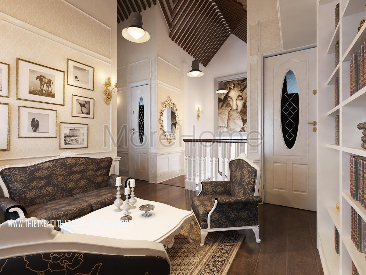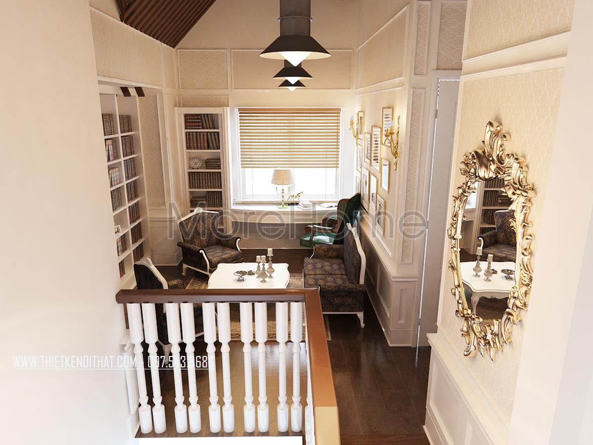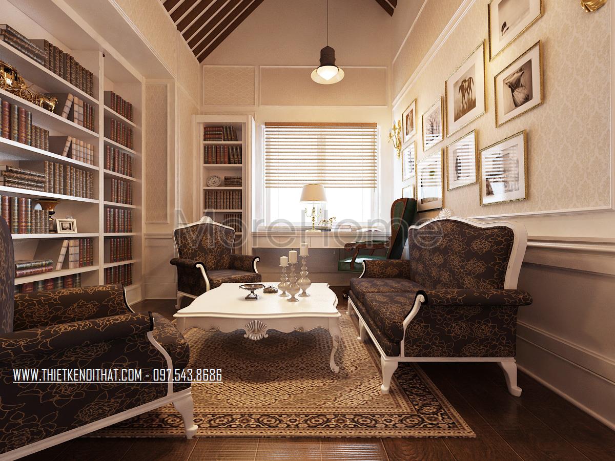 Là một người luôn bị thu hút bởi những trang sách hay, chủ nhân ngôi nhà rất ưu ái với không gian đọc sách vô cùng sang trọng và dễ chiu. Bước vào không gian nổi bật với gam màu nâu trầm của bộ bàn ghế sofa được thiết kế đối xứng một cách cân bằng tạo nét chắc chắn nhưng lại tinh tế bởi hoa văn cùng đường nét uốn cong trong từng chi tiết nhỏ của bộ bàn ghế sofa tân cổ điển hay của bàn trà sắc trắng nổi bật.